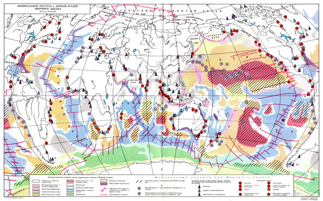 Минеральные ресурсы. Водная толща, дно и недра Мирового океана содержат разнообразные твёрдые, жидкие и газообразные минеральные образования, которые могут стать или уже стали объектом промышленного использования. Наибольшее практическое значение имеют нефть и газ. россыпные месторождения олова. редких металлов, золота. алмазов. железомарганцевые конкреции и корки, полиметаллические илы и массивные сульфиды, фосфориты. нерудные строительные материалы (см. карту).